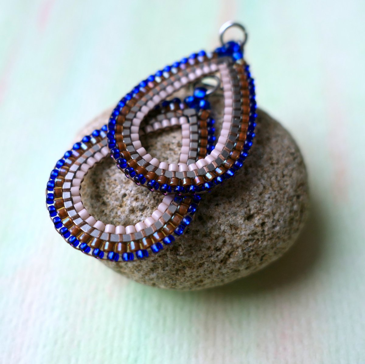 Ušito z japonského rokailu Miyuki různé velikosti a tvaru v barvě hnědé, pudrové a královsky modré.
