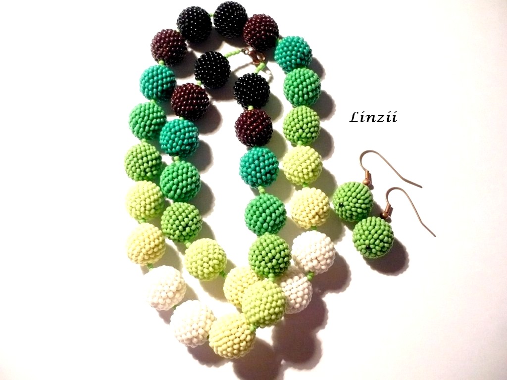 Luxusní náhrdelník z rokajlových korálků vytvořen technikou obšívání. V náhrdelníku je 32 jednotlivě obšívaných kuliček, ve kterých se skrývá dřevěný korálek. Průměr kuličky je 1,2 cm. Délka je 53 cm, je velmi příjemný na nošení a je návykový - struktura kuliček :). Náušnice jsou součástí kompletu.