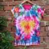 Originální malba na přední straně trička je vytvořena voskovou batikou (malba rozehřátým voskem) s použitím reaktivních barev na batiku za studena (žlutá, oranžová, růžová, zelená, modrá). Obrázek je dokreslen voskovkami na textil.