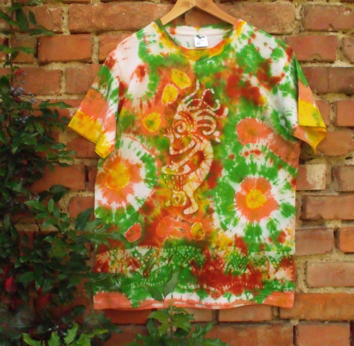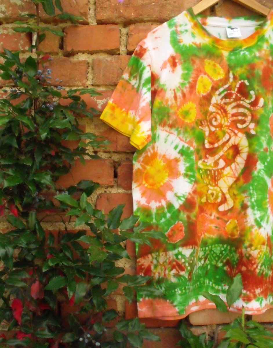 Originální malba na přední straně trička je vytvořena voskovou batikou (malba rozehřátým voskem) s použitím reaktivních barev na batiku za studena (žlutá, oranžová, zelená, hnědá). Obrázek je dokreslen voskovkami na textil.
