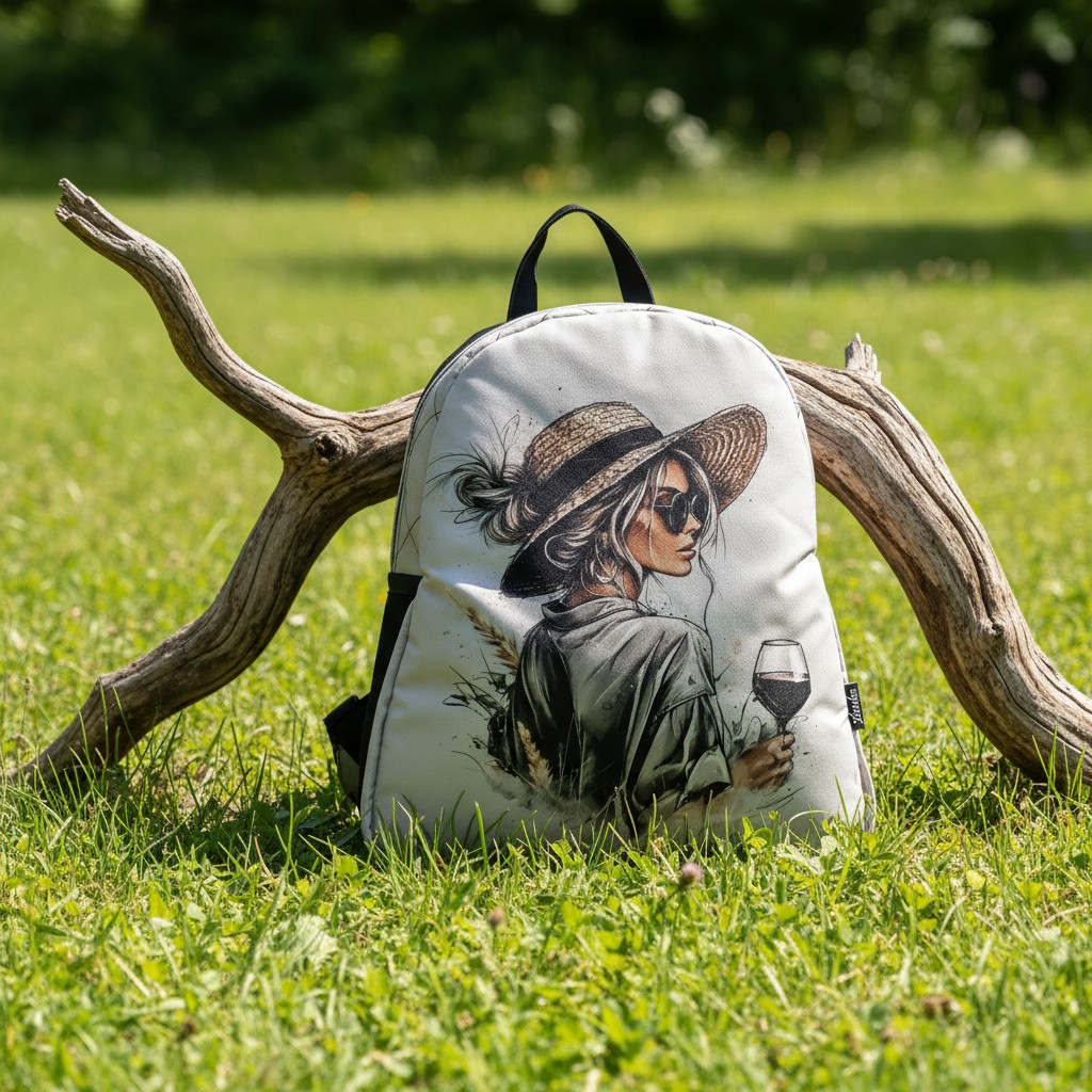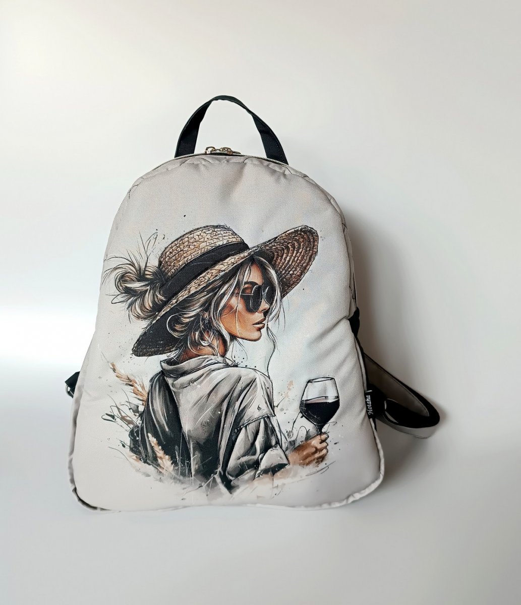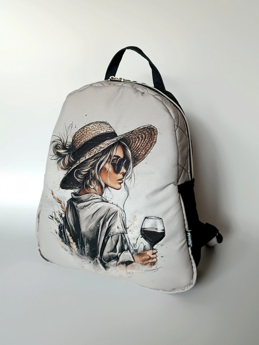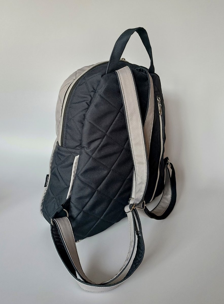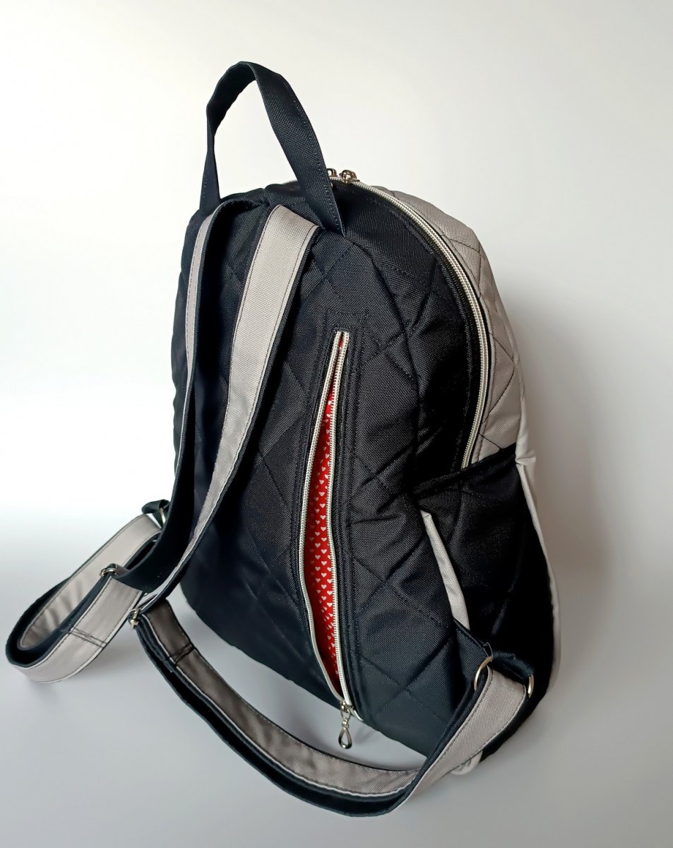Větší batoh, vyztužený pěnou a celý prošitý.