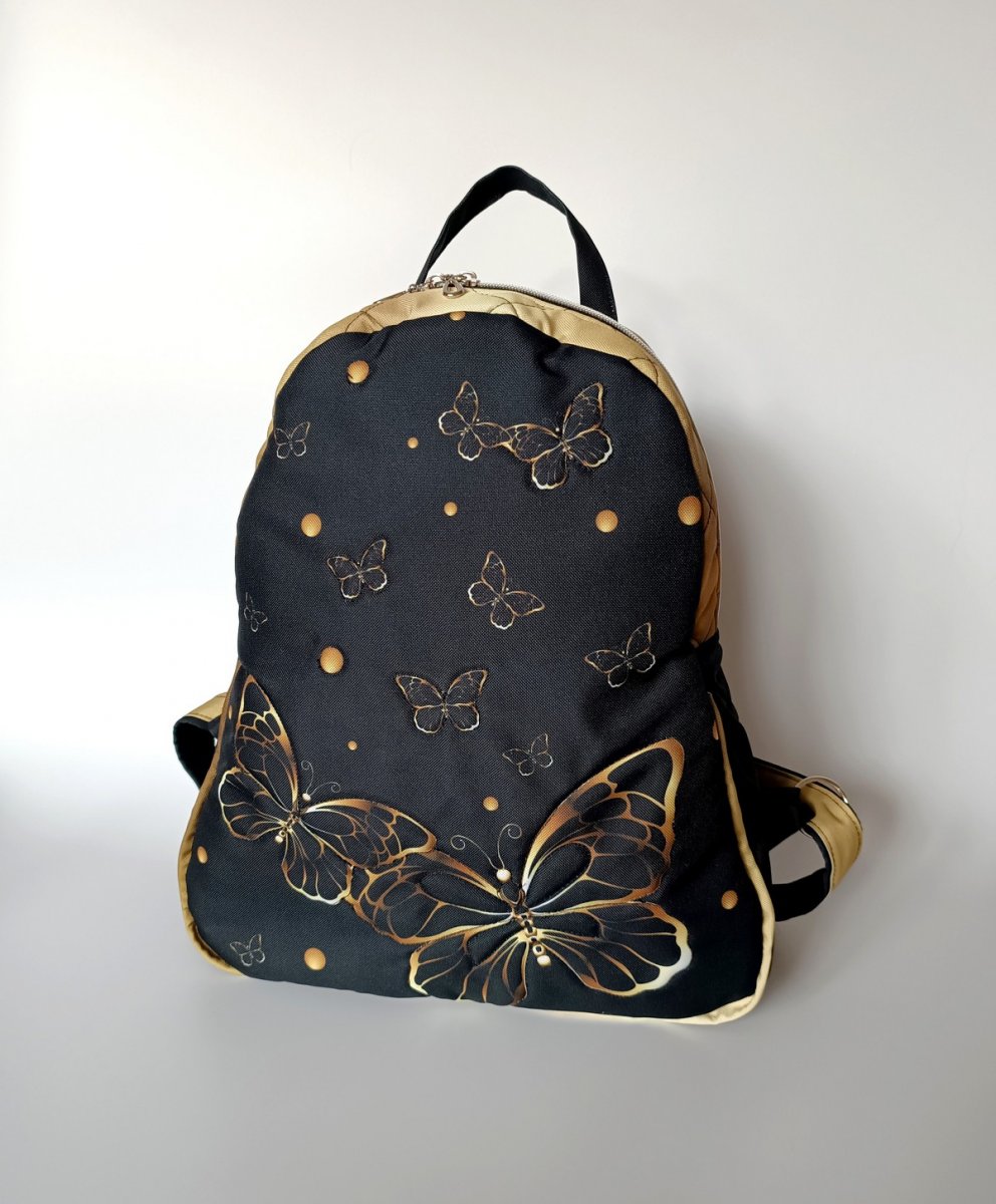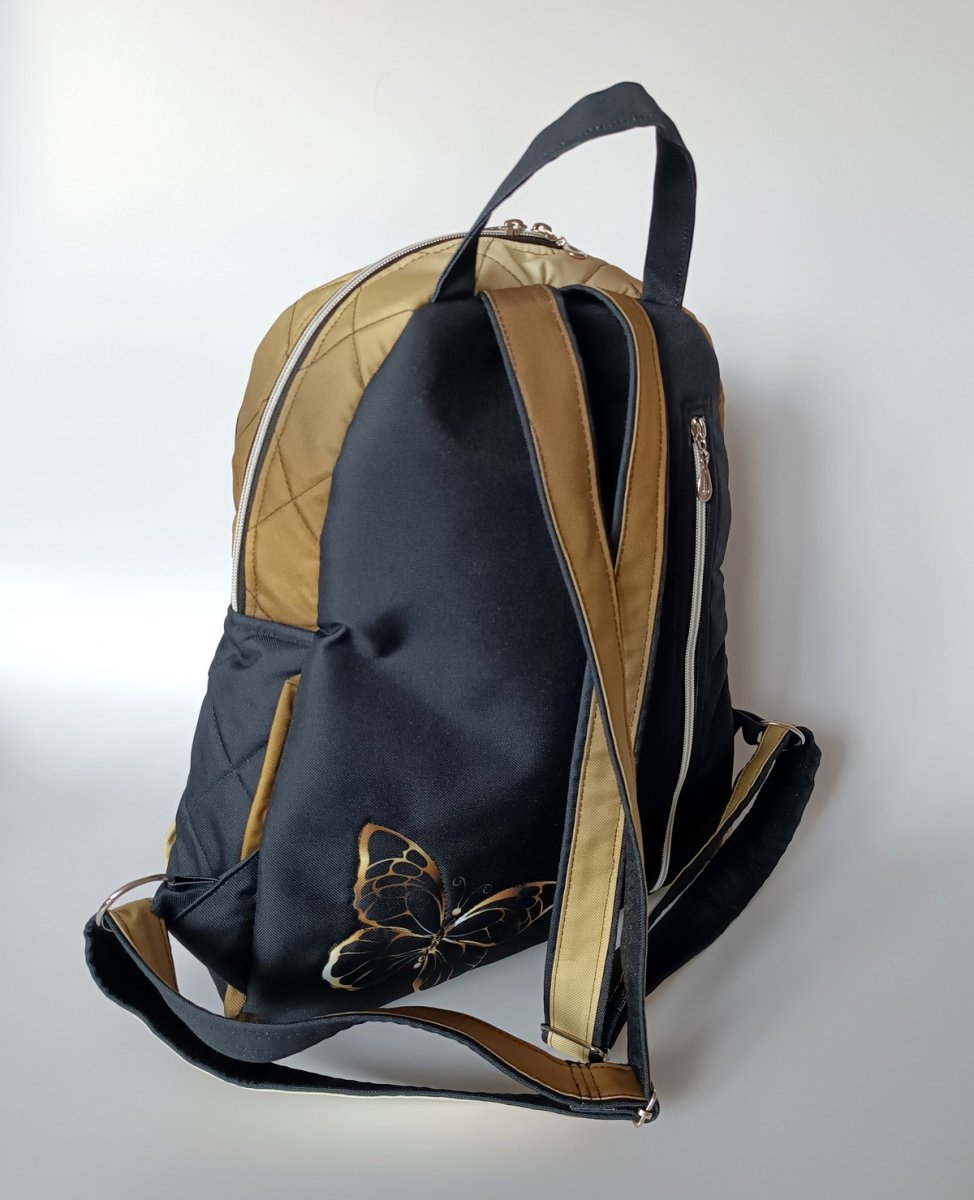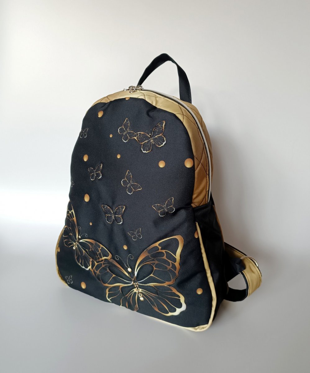 Větší batoh, vyztužený pěnou a celý prošitý.