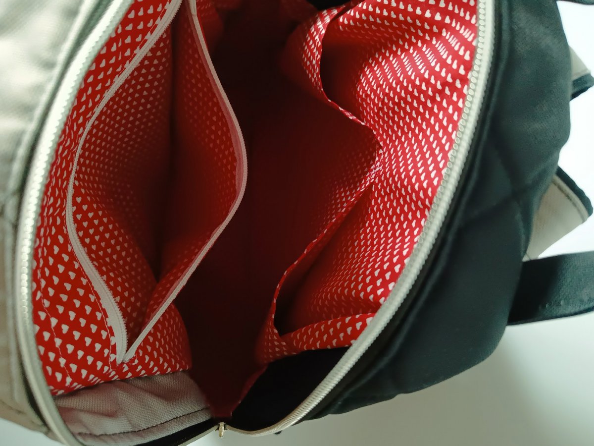 Podšívka je bavlněná, uvnitř jsou dvě obyčejné kapsy a jedna velká na zip.