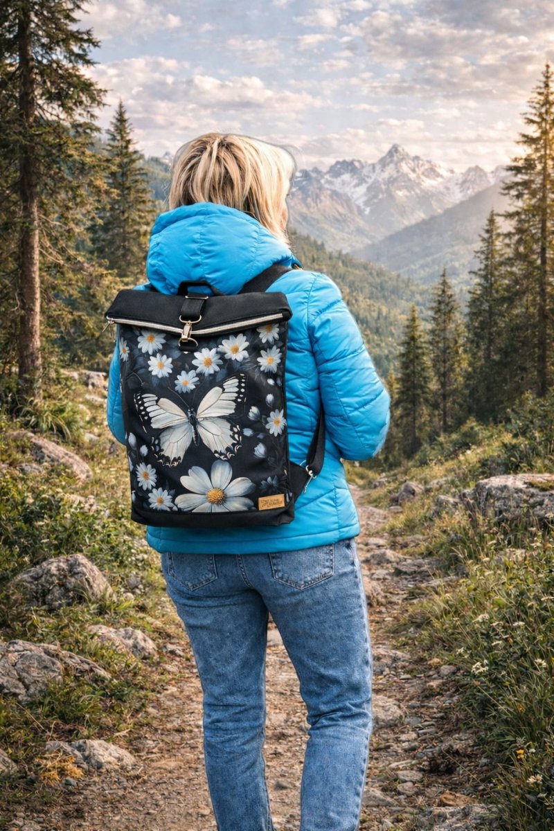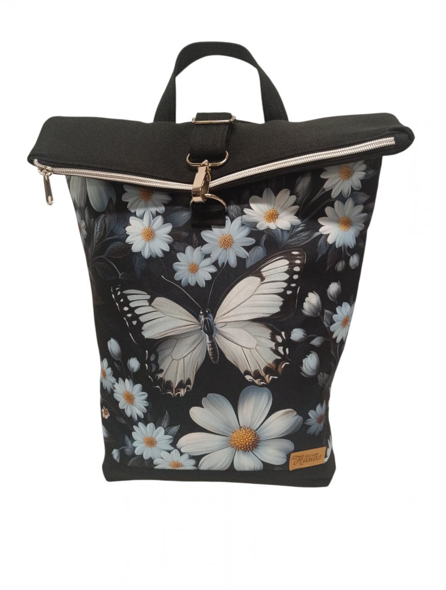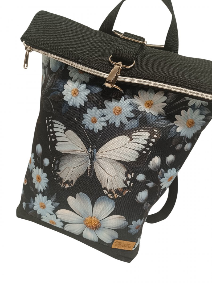 Překloplný batoh Lucas je ušitý z potahové látky a kočárkoviny. Je vyztužený, vypodšívkovaný. Vejde se A4.