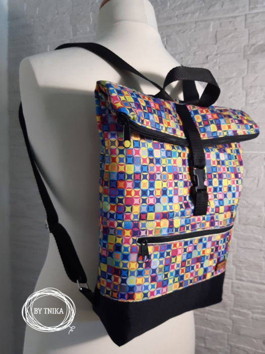 Překlápěcí uzavírání na zip, zajištění karabinou.