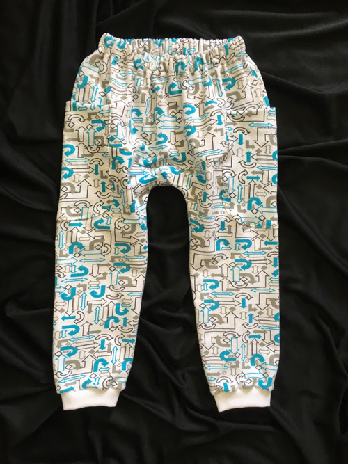 100% bavna, ušity jsou z použitých materiálů, mají kapsičky, pro děvče i chlapce, velikost asi 98, pas 42 - 86 cm, délka 55 cm, upcyklace