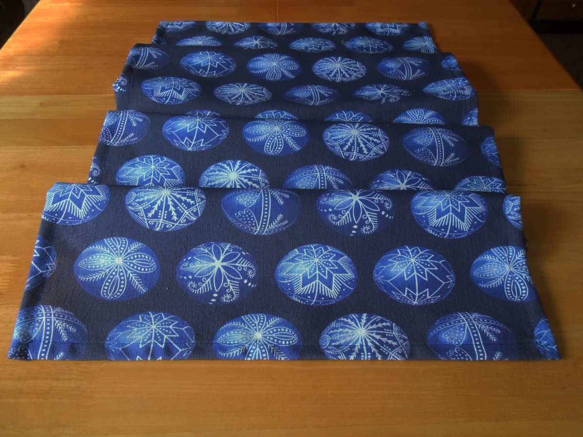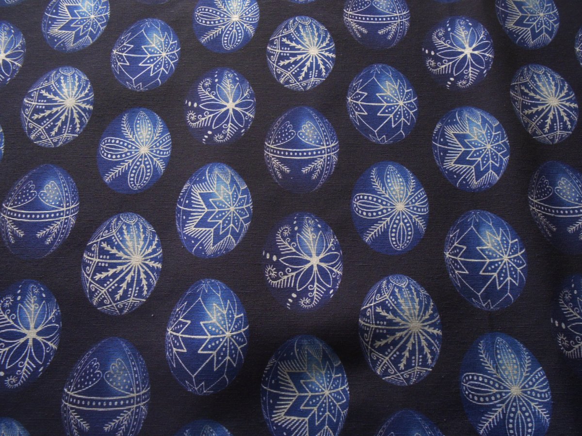 Ubrus (středový běhounek) je ušit ze směsové dekorační látky barvy tmavě modré s bílými kraslicemi.