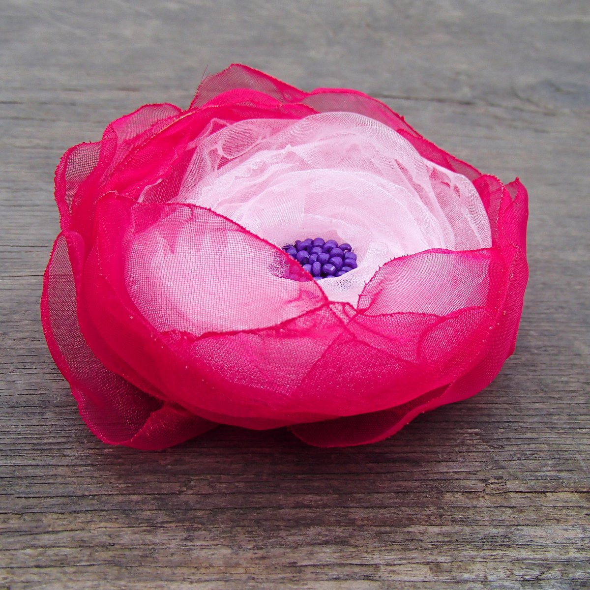 Oživte Váš outfit květem z organzy v odstínech růžové. Střed je vyšitý korálky.