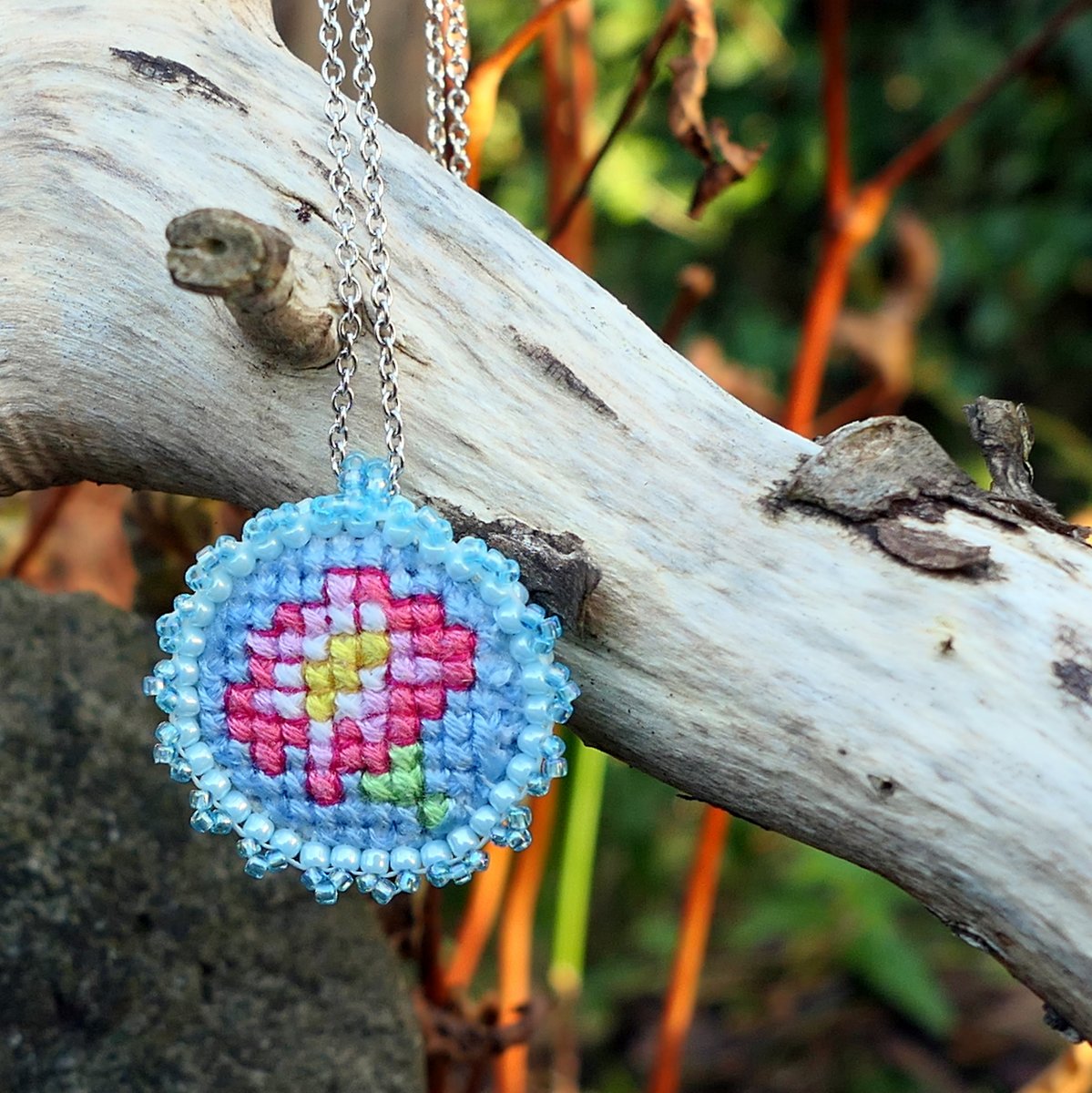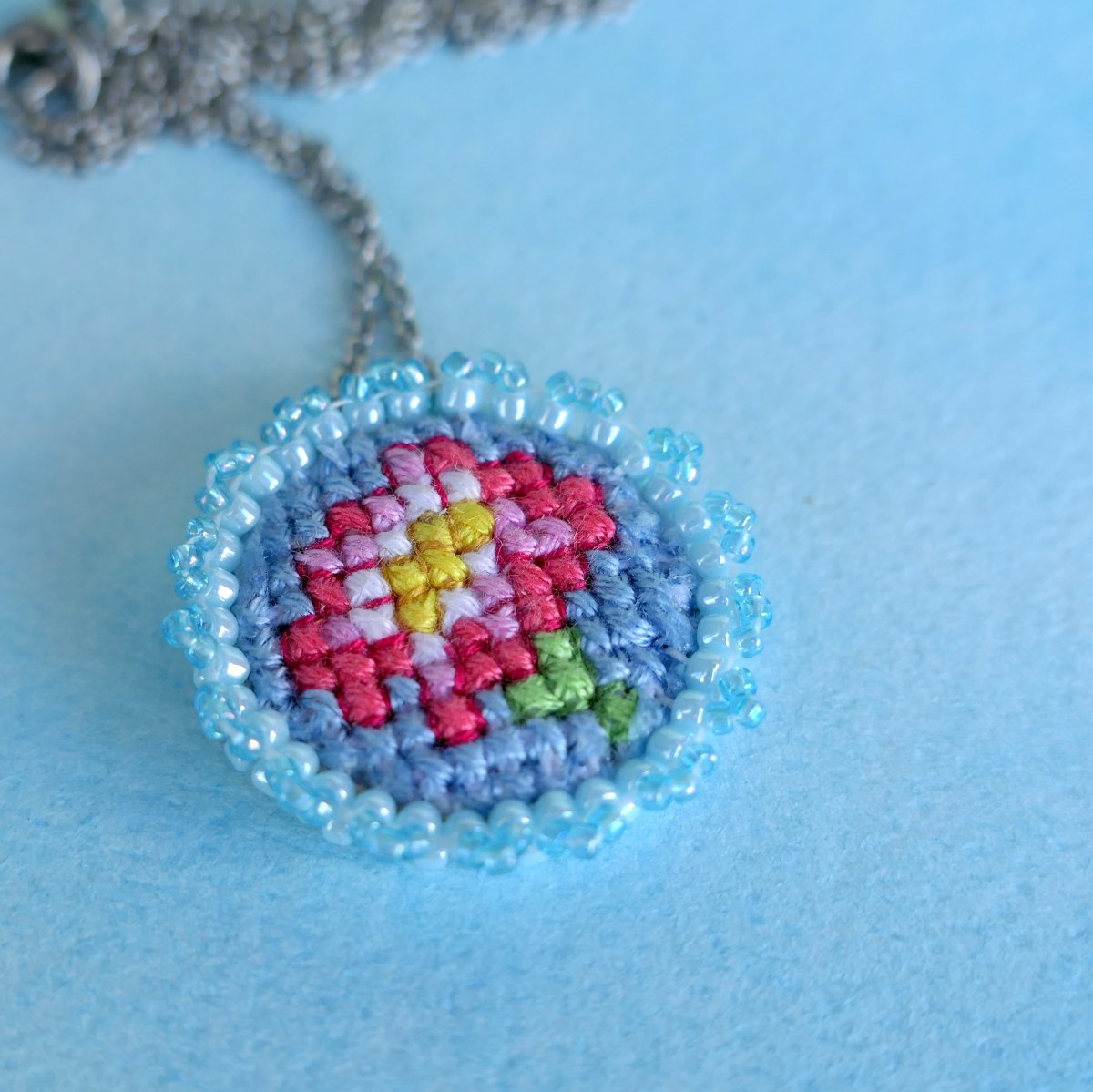 Drobný přívěsek s vyšitou sedmikráskou. Pro obšití jsem použila japonský rokail TOHO v modré barvě. Vyšito přízí Mouline. Podloženo textilí alcantara.