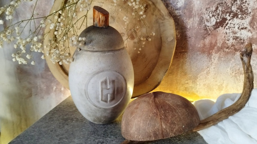 Betonová dóza v přirozené barvě betonu, s pokličkou a dřevěným úchytem.