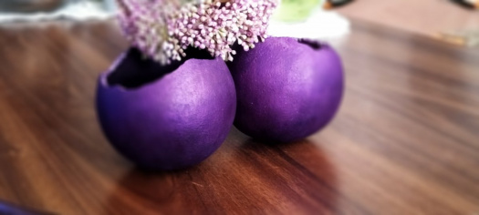 Dvě betonové skořepiny-svícen v barevném provedení temně fialová.