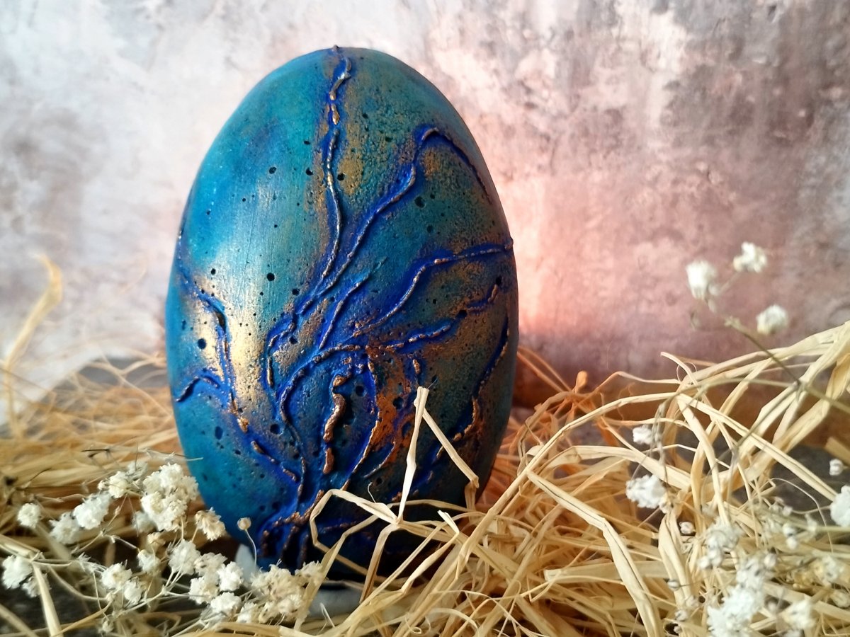 Betonové dekorativní vejce v barevném provedení ftalocyaninová modrá+královská modrá, vosková pasta bronzová.