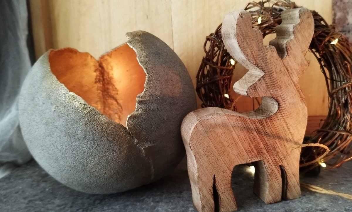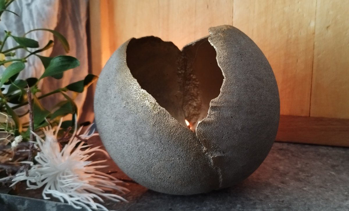Betonový svícen mušle je v přirozené barvě betonu, přiznané spoje a vnitřek je nepravidelně zvýrazněn zlatou barvou.