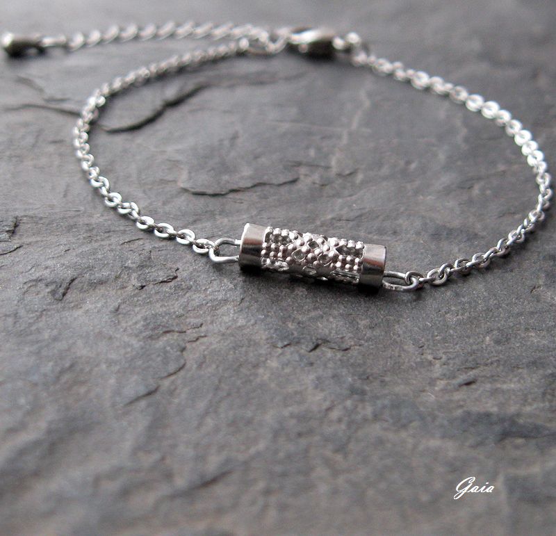 Náramek v minimalistickém stylu se zdobeným válečkem z chirurgické oceli. Ocel je vhodným materiálem pro alergiky na kovy.