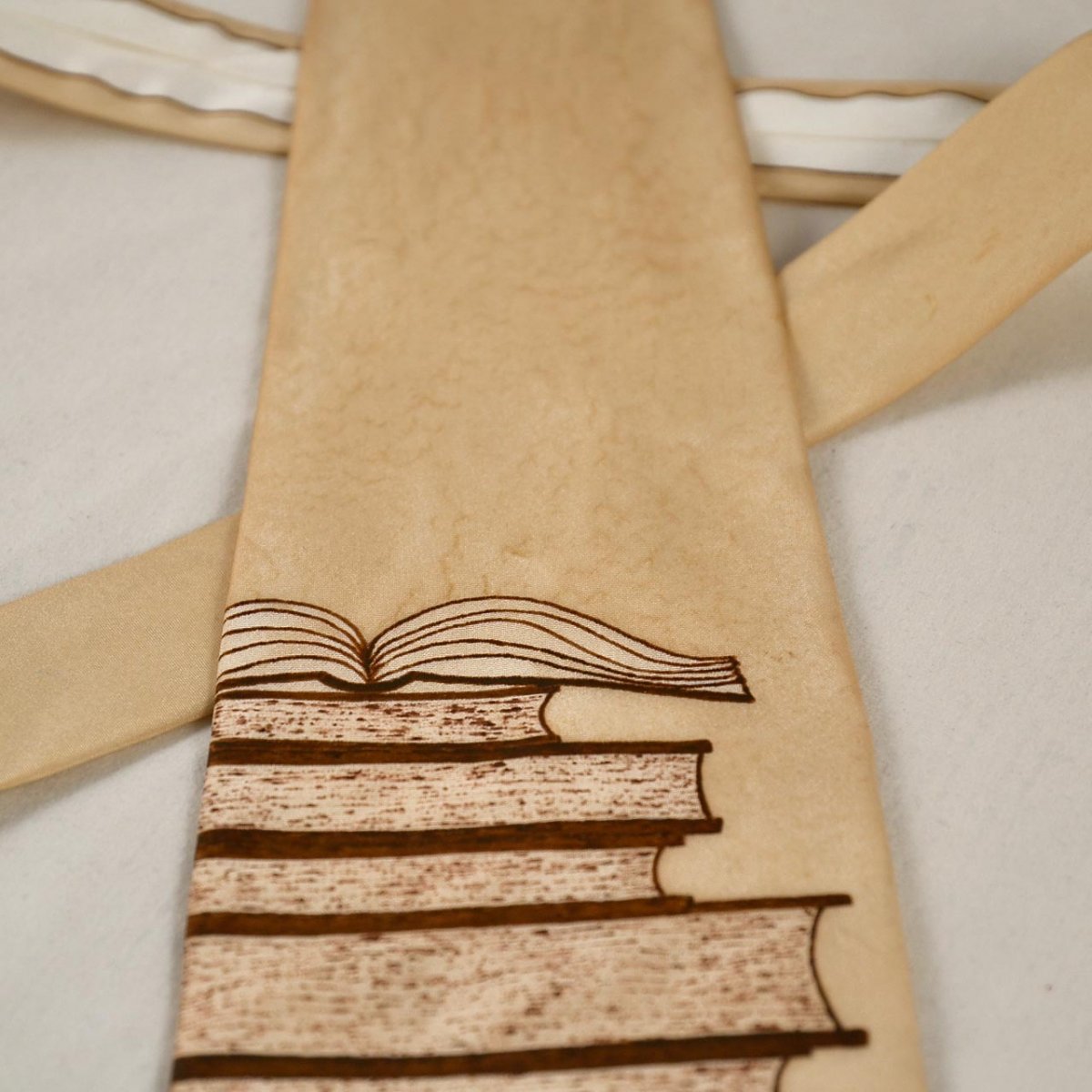 Ručně malovaná hedvábná kravata klasické velikosti 9,5 x 140 cm, přední strana má béžový podklad s jemným vzorkem a motiv knih namalovaný hnědou konturou, zadní strana je bílá, 100% přírodní hedvábí Habotai 8.