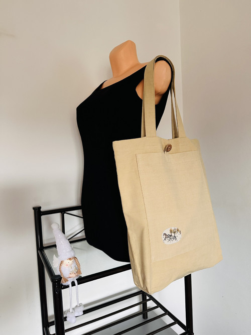 plátěná taška, je ušitá ze strašího materiálu, zdobená koníkama, má větší kapsu na kapesníky, časopis, dokumenty, délka od ramene 75 cm, šíře 40 cm, délka 44 cm.