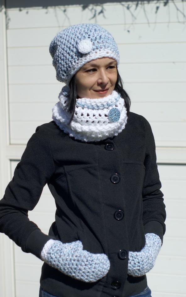Jemnučký zimný setík skladajúci sa z bielomodrej čiapky dozdobenej obháčkovaným bielym gombíkom, bieleho nákrčníka s gombíkom vo farbe čiapky a rukavíc-palčiakov.
