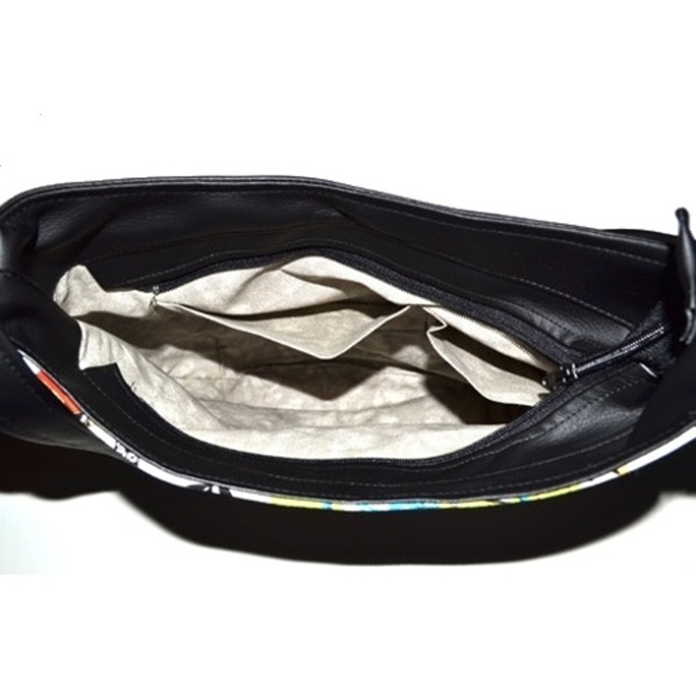 Kabelka z originální bavlněné látky kombinované s kvalitní černou koženkou. Vzor barevných čtverců na černém podkladu. Zadní strana je z černé koženky