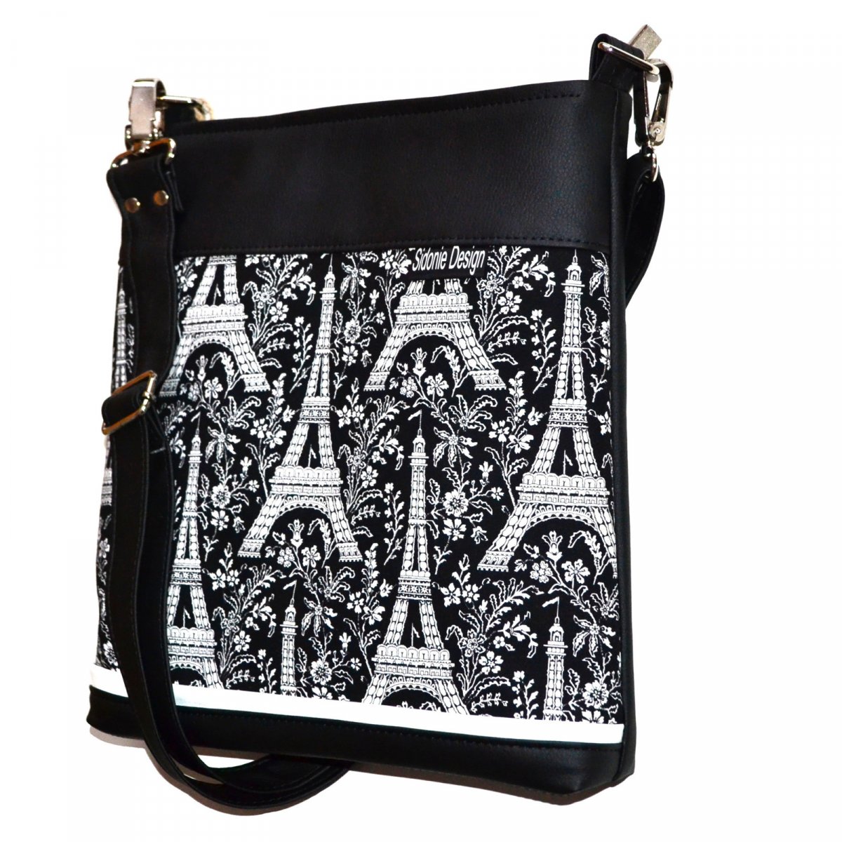 Černá koženka v kombinaci s elegantní látkou s světlým podkladem a motivy Francie, je elegantní a také praktická pro každou příležitost. Popruh je z černé kvalitní koženky. Vzor může být mírně posunutý, podle střižení. Zadní strana je z koženky.