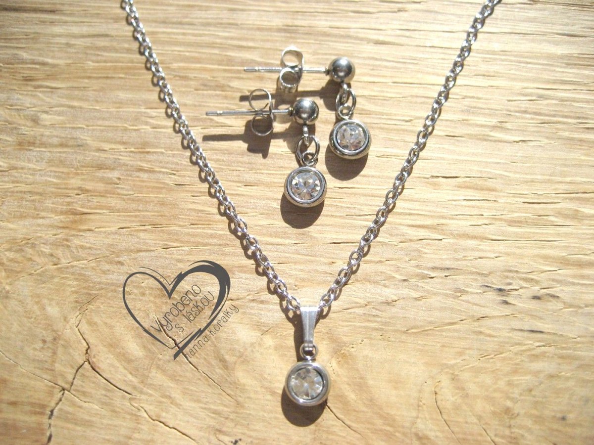 Jemná, jednoduchá a přitom elegantní sada řetízku a náušnic z nerez oceli s bílým skleněným korálkem, délka řetízku 45 cm, průměr přívěsku 5 mm