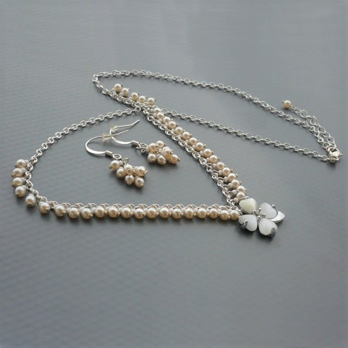 Náhrdelník: Dominantou náhrdelníku je přívěsková část, kterou tvoří jemný čtyřlístek s kamínky přecházející bílé barvy (efekt kočičích očí). Přívěsek je zavěšen na řetízku, který je v přední části doplněn bílými voskovanými českými perličkami a drobounkými bílými skleněnými korálky.