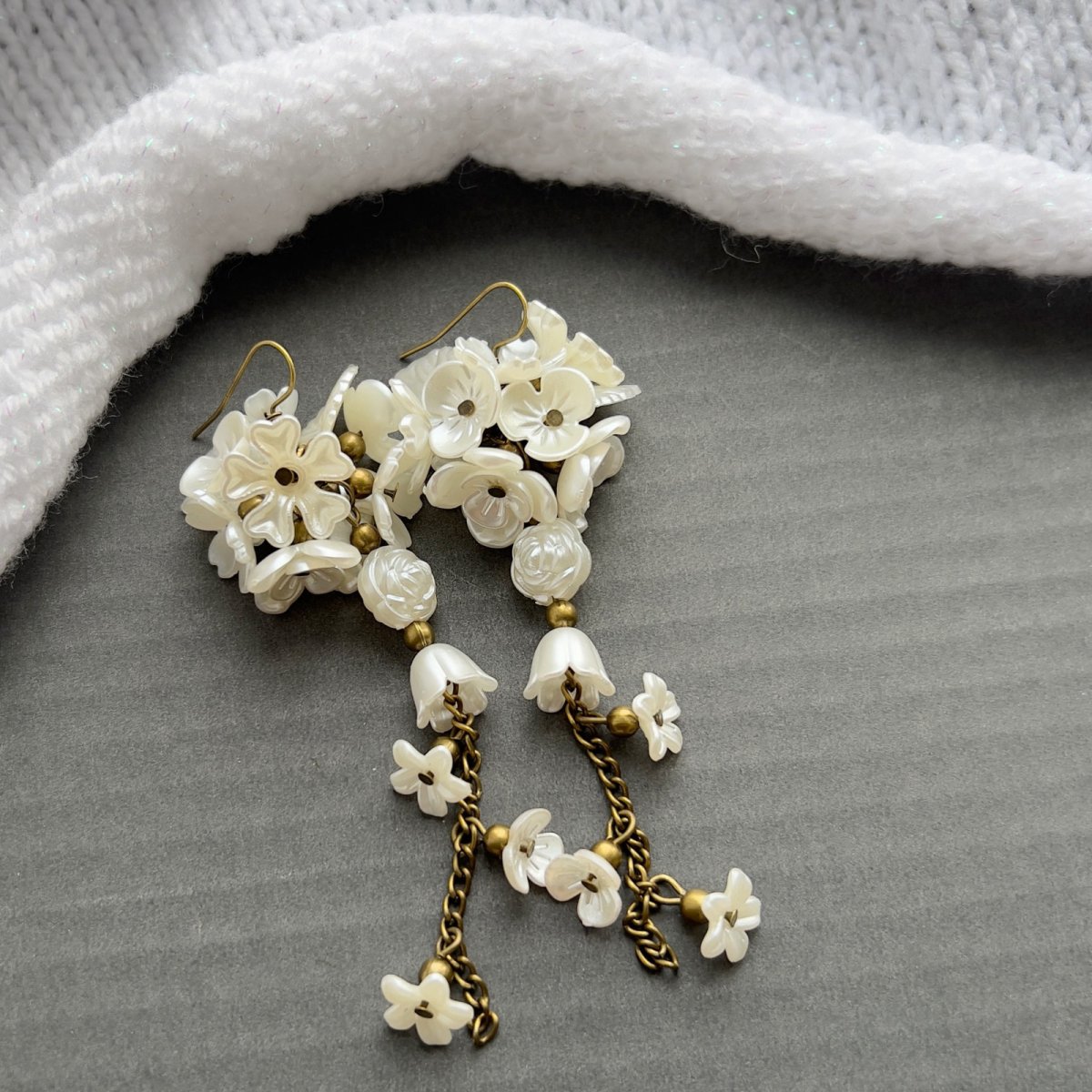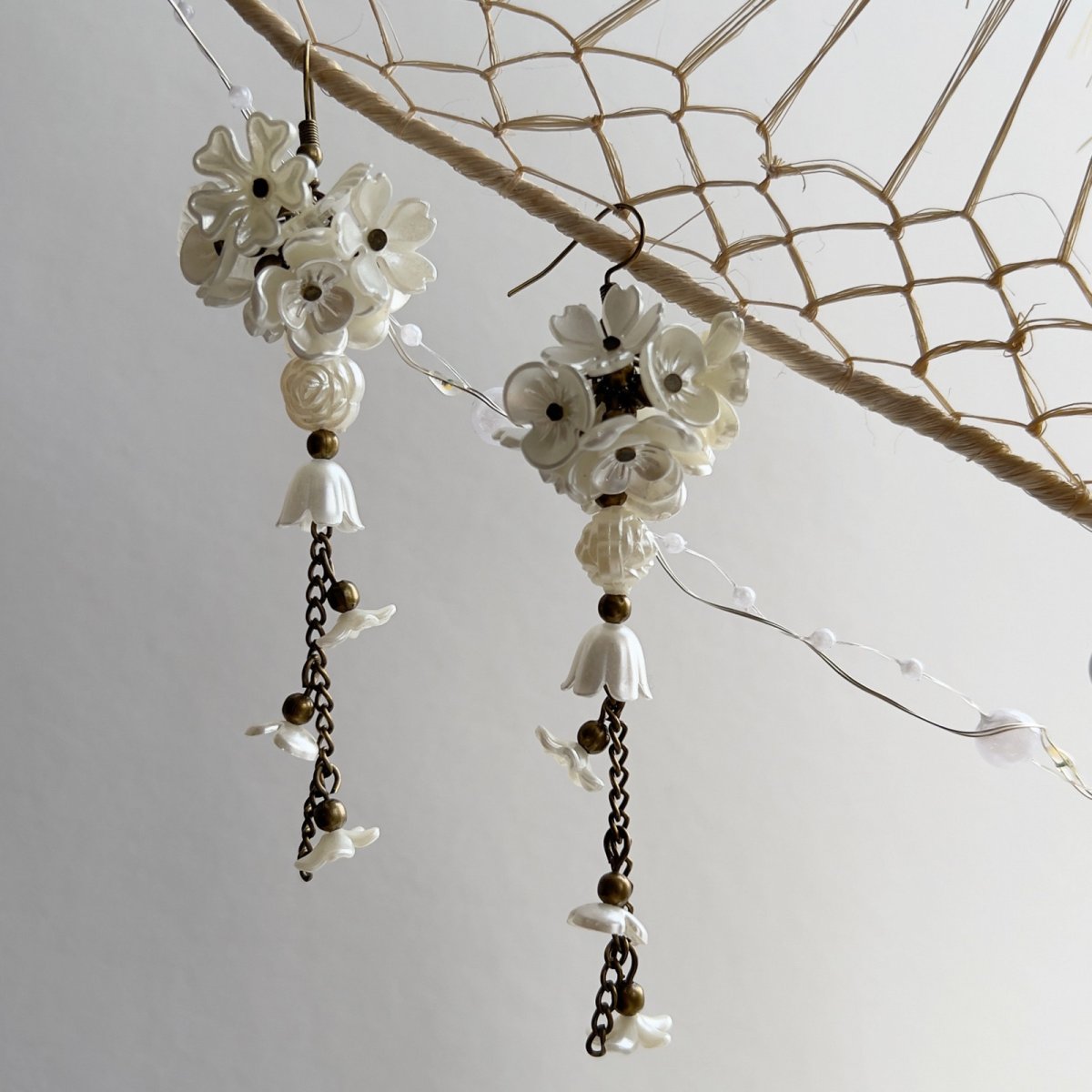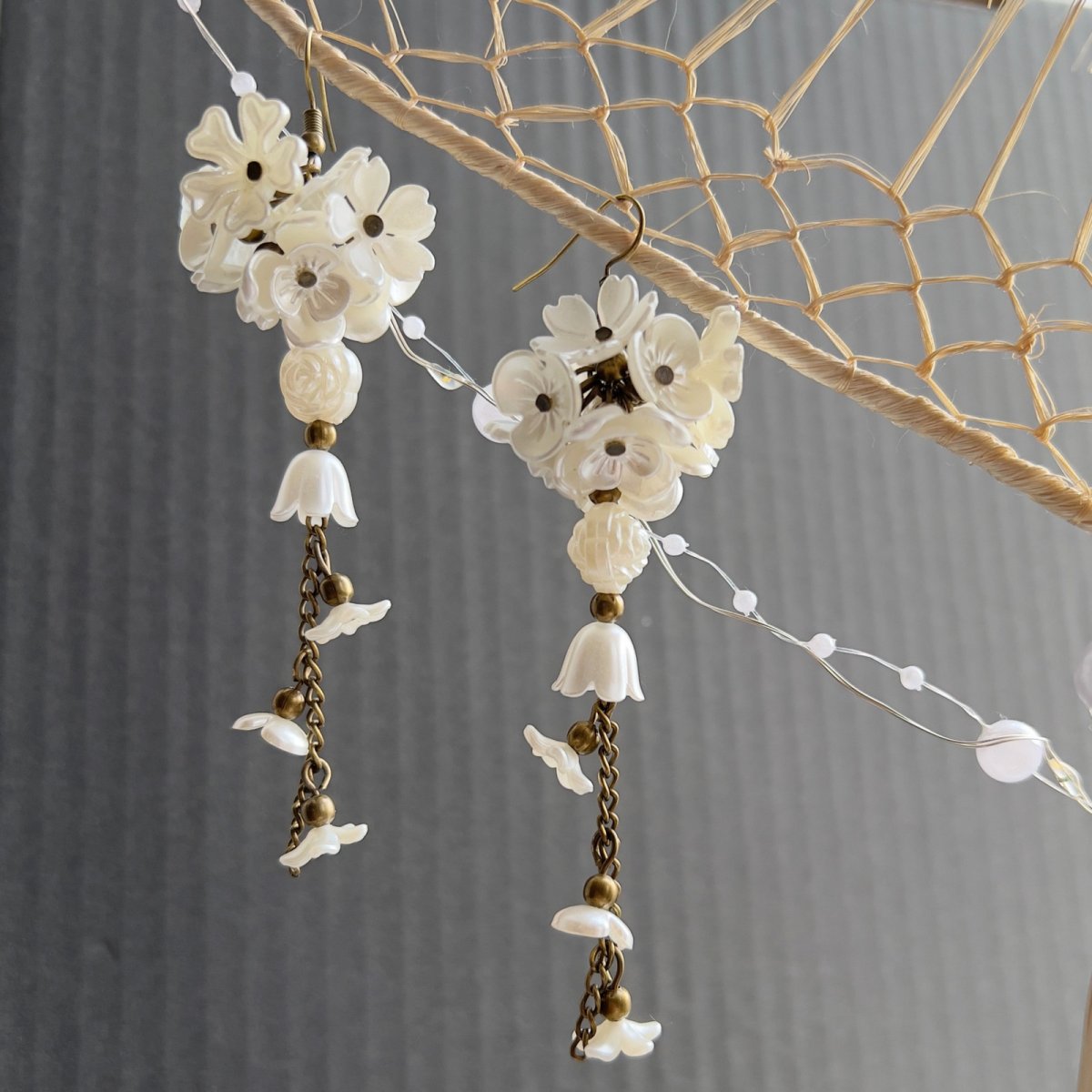 Dlouhé náušnice s plastovými květinkami, lístečky a zvonečky na mosazných kroužkách a řetízku. Délka od háčku cca 9 cm, gumové zarážky.