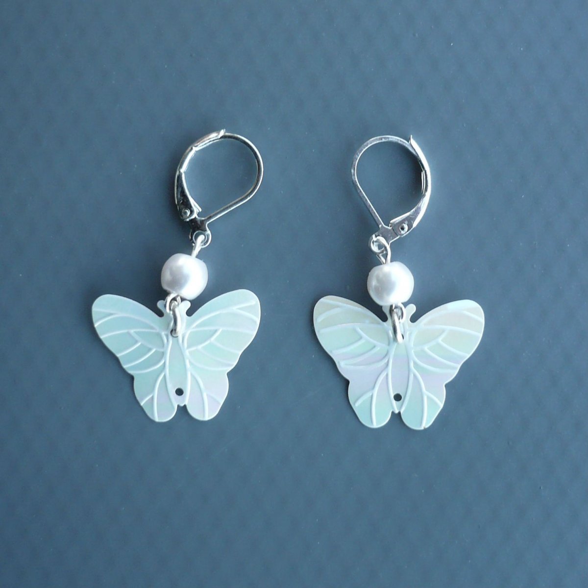 Lehoučké nejen dětské náušnice z horní bílé voskované perličky a spodního lehoučkého bílého lesklého motýlka.