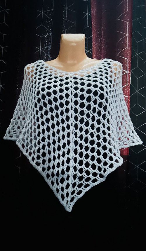 antipillingová příze - nežmolkatí, velikost asi 36 - 40, délka 62 cm - měřila jsem od ramene až po tu špičku rovně dolů, délka od krku 44 cm, na štíhlou postavu o výšce 160 cm, je konec ponča asi k lokti.
