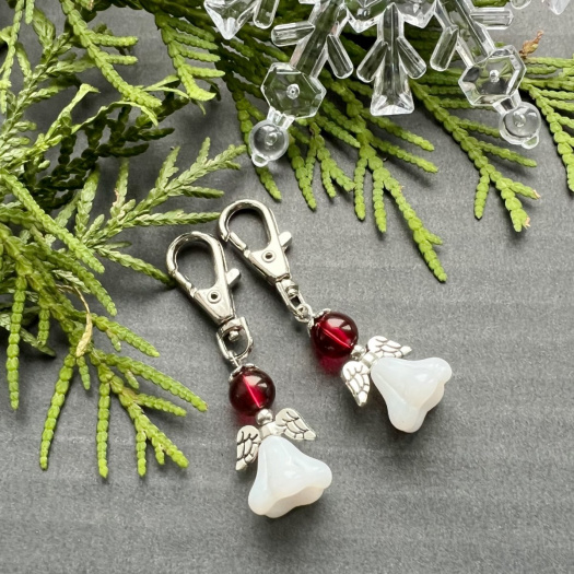 Andělský přívěsek na klíče, na kabelku nebo na baťůžek. Andílek je ze skleněného bílého zvonečku, plastového korálku a kovových komponentů v barvě platiny. Celková délka vč. karabinky 5,5 cm, andílek má 3 cm