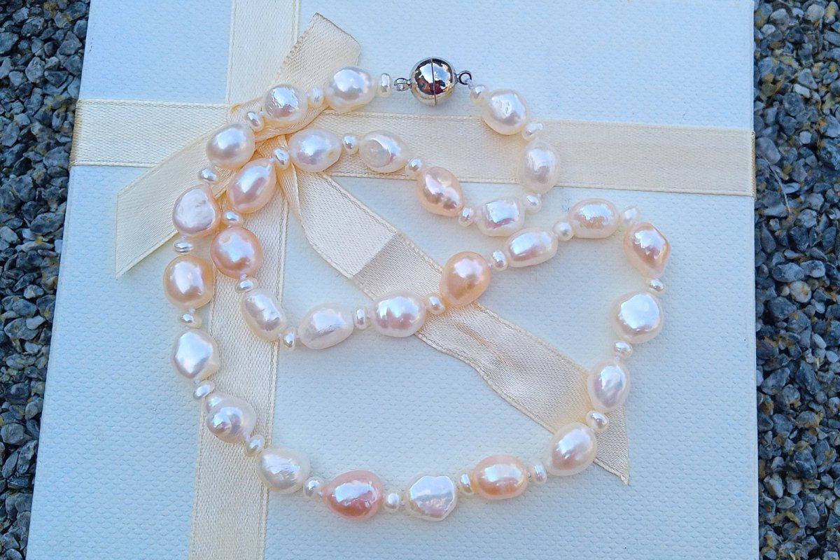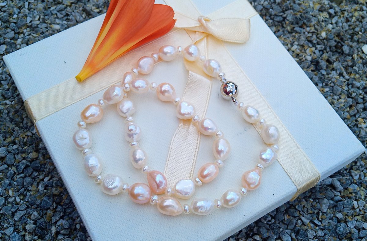 Bílé a světle růžové dokonale lesklé barokní říční perly o velikosti cca 10 mm střídající se s drobnými bílými perličkami o vel. cca 3-4 mm v něžném uzlíkovaném náhrdelníku se zapínáním na pevný magnet, díky jemu je zapínání jednoduché a zvládnete si jej nasadit sama bez asistence.