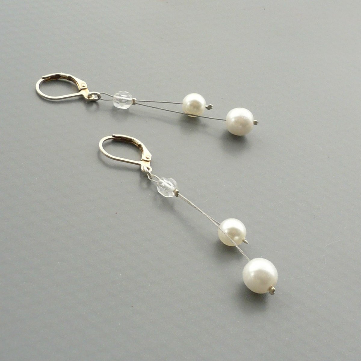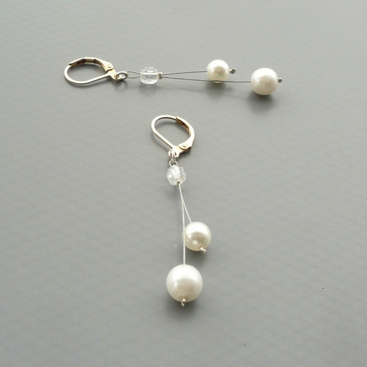Jednoduché náušnice jsou tvořeny dvěmi "ocásky" z bižuterního lanka stříbrné barvy, které jsou zakončeny bílou voskovanou perličkou. V horní části je čirý broušený skleněný korálek.