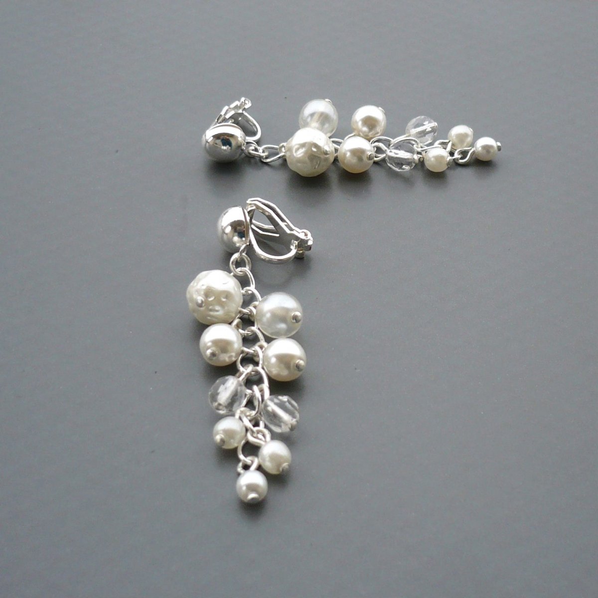 Náušnice jsou z bílých voskovaných perliček a čirých broušených korálků, které jsou uspořádané do jemného hrozínku.