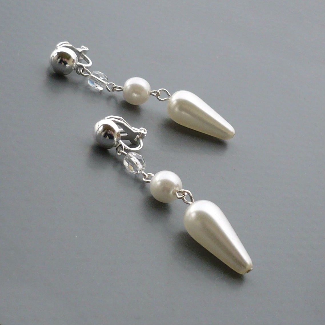 Náušnice jsou tvořeny čirým broušeným skleněným korálkem a bílými voskovanými perličky, přičemž spodní je v podobě obrácené velké kapky.
