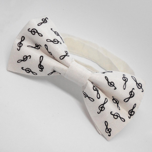 Ručně malovaný bílý hedvábný motýlek s houslovými klíči namalovanými černou konturou, 100% přírodní hedvábí Habotai 8.