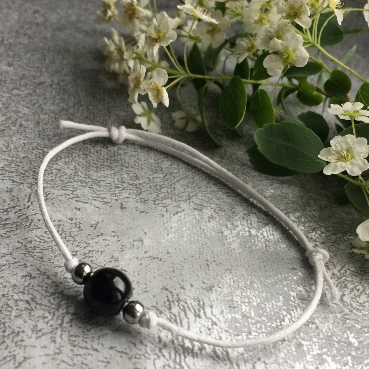 Kabbalah náramek z bílé voskované šňůrky s kuličkou onyxu (8 mm) a s korálky z nerez oceli. Univerzální velikost - dá se nastavit díky posuvným uzlíkům. Vhodný na dámské zápěstí.