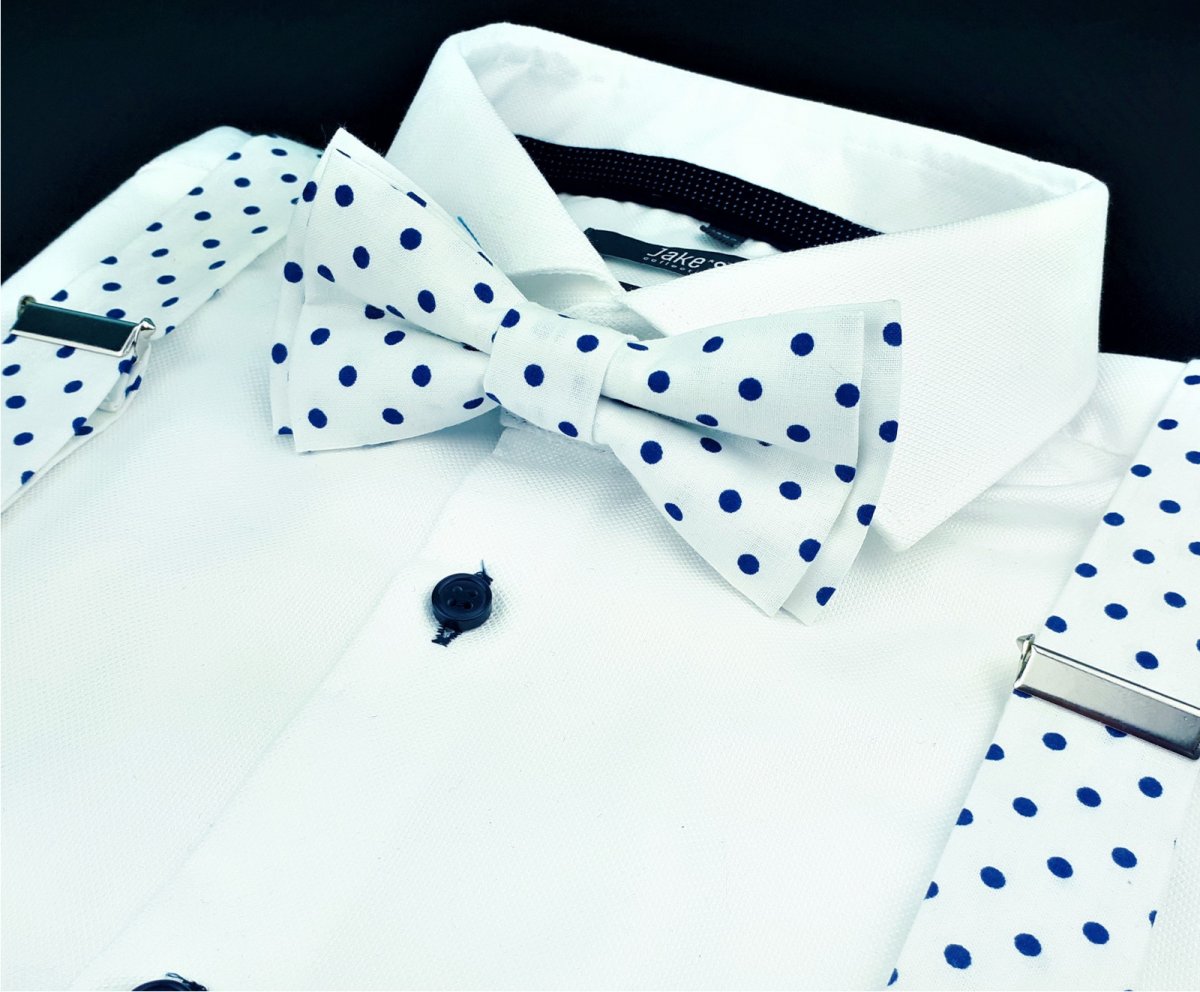 Pánsky set motýlik, traky a vreckovka do saka v elegantnom bielom prevedení s modrými bodkami, ktorý dokonale oživí Váš outfit a zvýrazní vašu osobnosť. Polka dots bodky sú hitom tohtoročnej sezóny! Ak Vám chýbajú polka bodky v bielomodrom prevedení, potom si jednoducho musíte zaobstarať tento skvelý model do Vašej motýlikovej kolekcie.