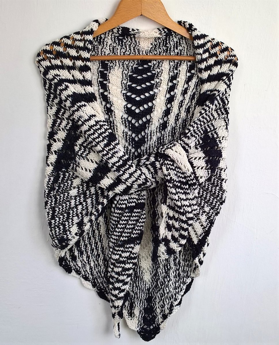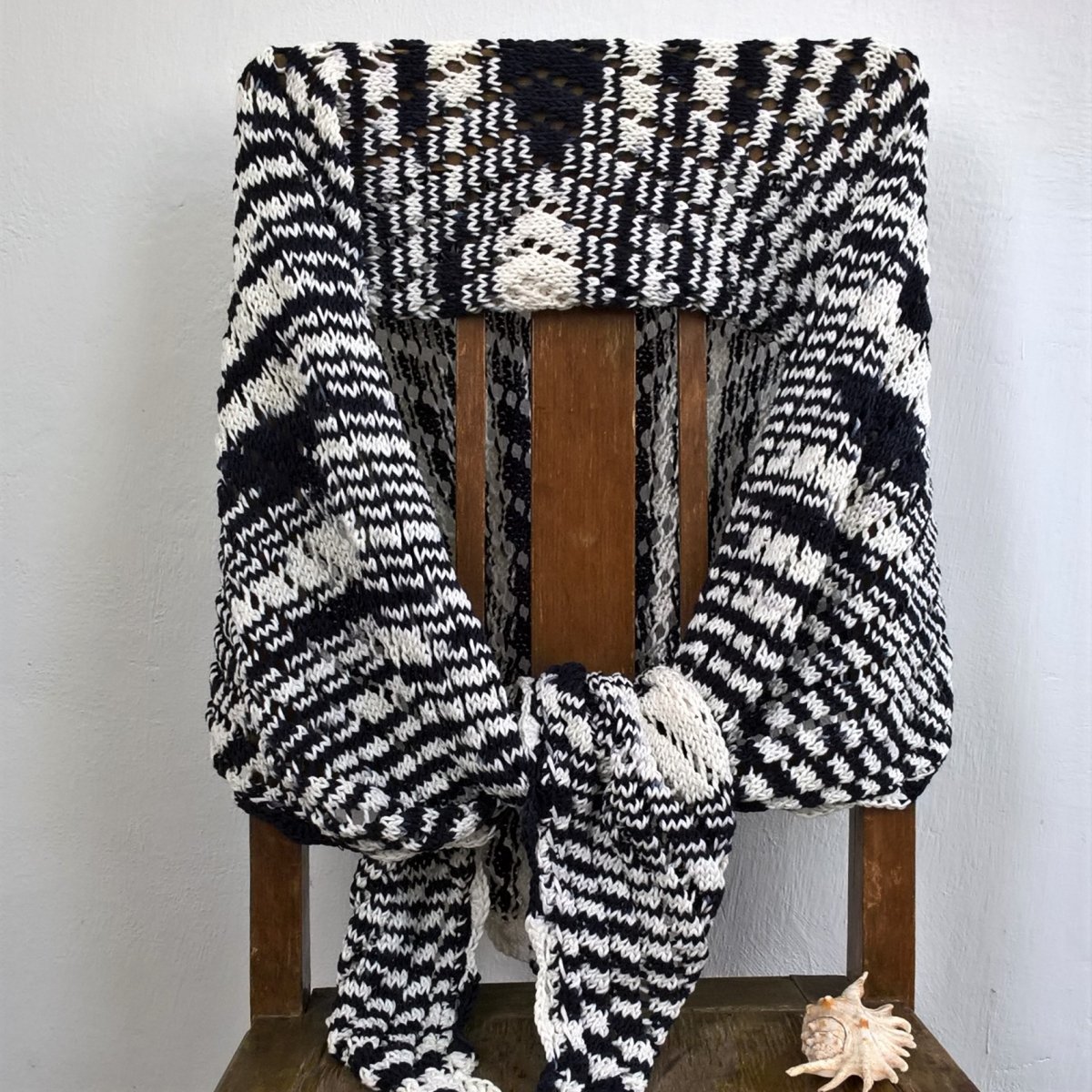 Šátek je pletený dírkovaným krajkovým vzorem vodorovně od jednoho cípu k druhému. Šátek je celý obháčkovaný, kratší okraje jsou ještě obháčkovány obloučky.