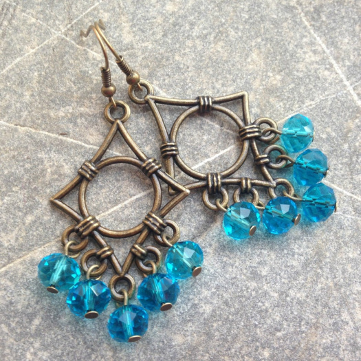 Delší výrazné náušnice - mosazná ramínka ve tvaru kosočtverce s modrými skleněnými broušenými korálky. Délka od háčku 6 cm, gumové zarážky.