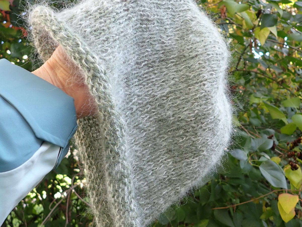 Je upletená na kruhových jehlicích beze švů z dvou druhů příze, jedna je 100 % merino vlna a druhá má složení 75% dětský mohér a 25% morušové hedvábí. Mohér je textilní vlákno ze srsti angorské kozy a hedvábí je přírodní bílkovinné vlákno vyráběné z larev bource morušového.