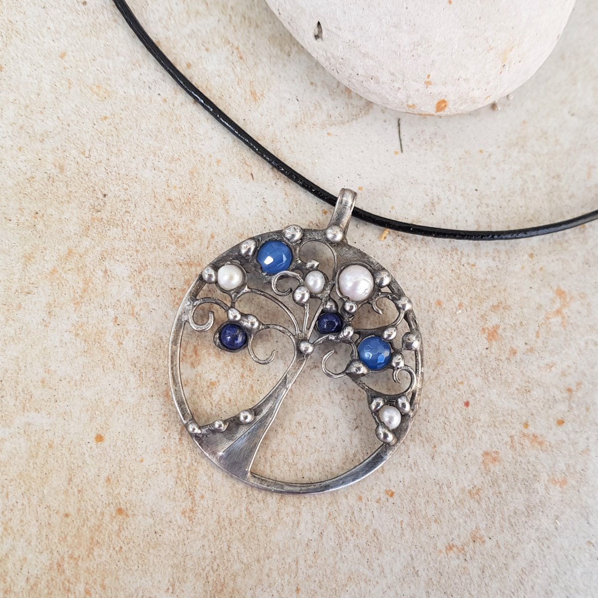 Ocínovaný náhrdelník inspirovaný tvorbou Gustava Klimta z lapis lazuli, jadeit, říční perla patinovaný, leštěný, ošetřený antioxidantem.