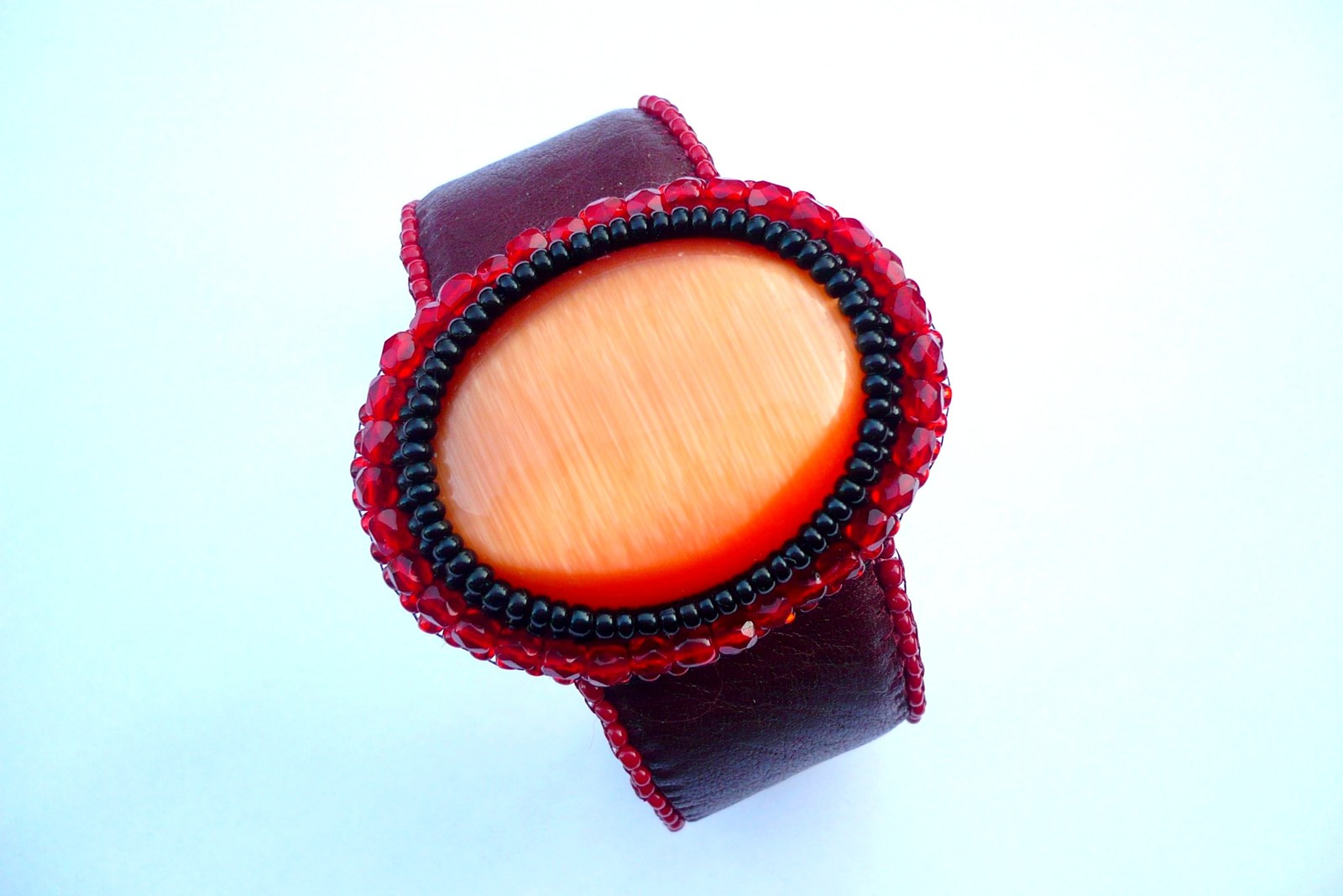 Ručně šitý náramek z rokajlových korálků zemitých barvev. Náramek je vytvořen technikou beadweaving. Uprostřed šperku je kabošon oranžové barvy s efektem kočičího oka, obšitý korálky. Celý náramek je pošitý kvalitní kůží v barvě bordó, z obou stran. Náramek je variabilní - na kovovém korpusu, v nejširším místě měří 4,5 cm. Je hypoalergenní.
