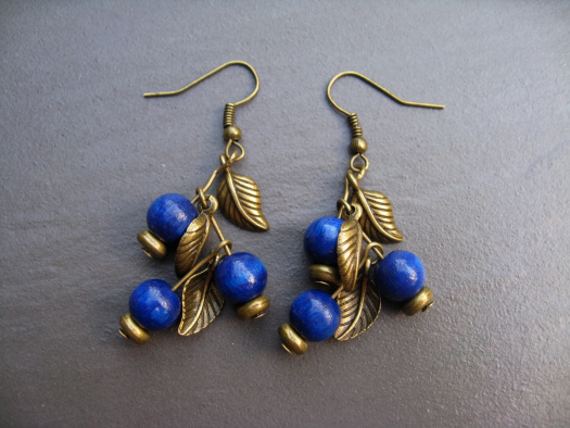 Náušnice tvořené kovovými lístky a dřevěnými kuličkami. Délka vč. afroháčku cca 5 cm, komponenty ve starobronzové barvě.