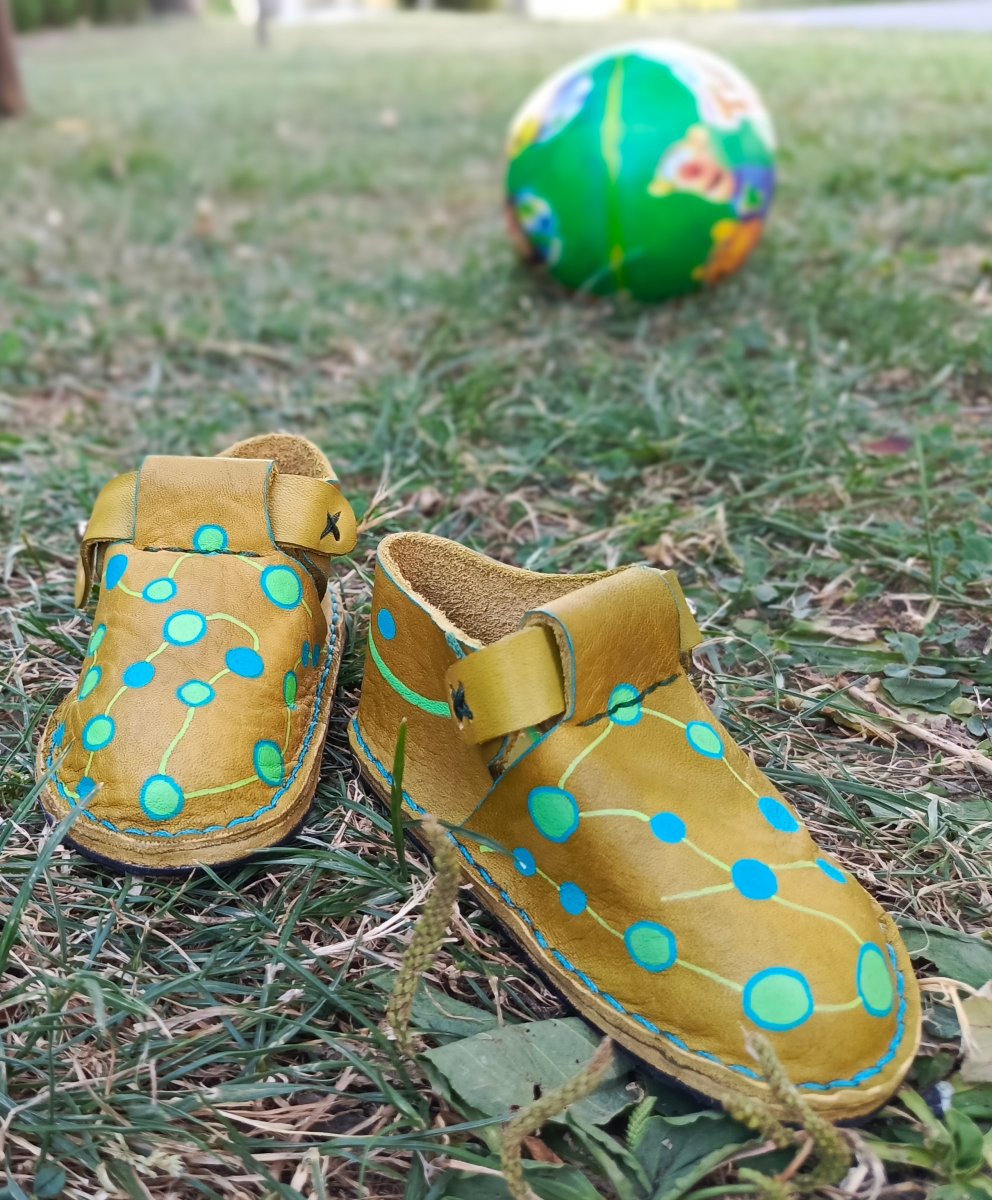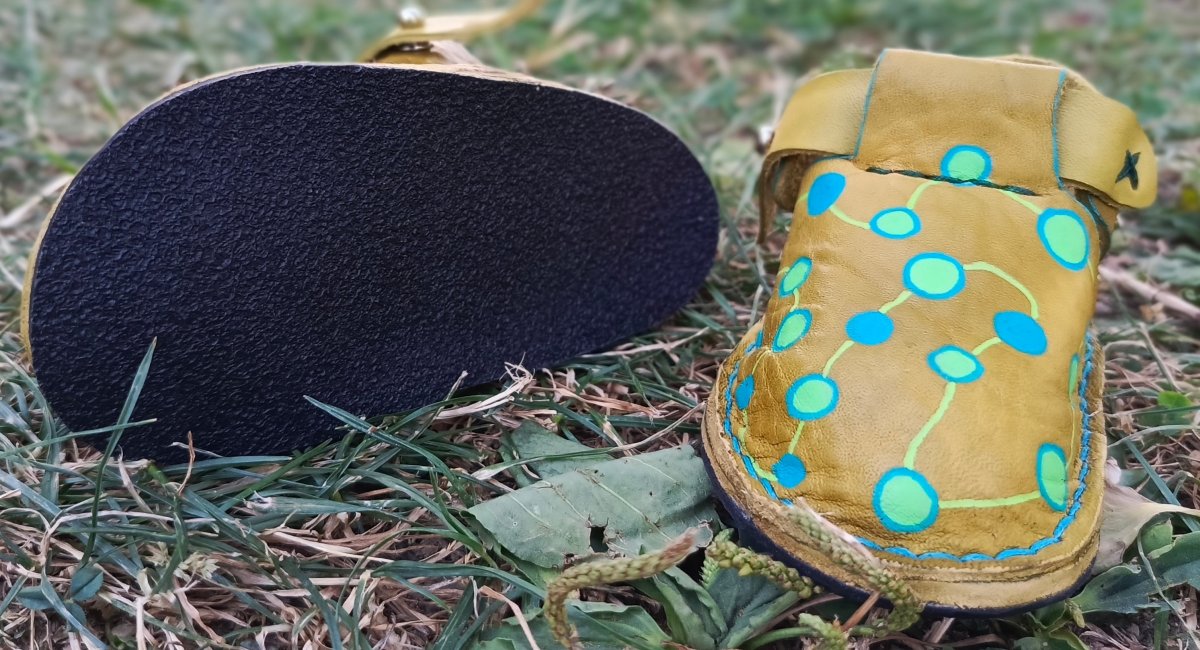 Kožené ručně šité a barvené dětské botičky. Jsou vyrobeny z valchované hovězí kůže, podlepené tenkou plotnou o síle 1,8mm.