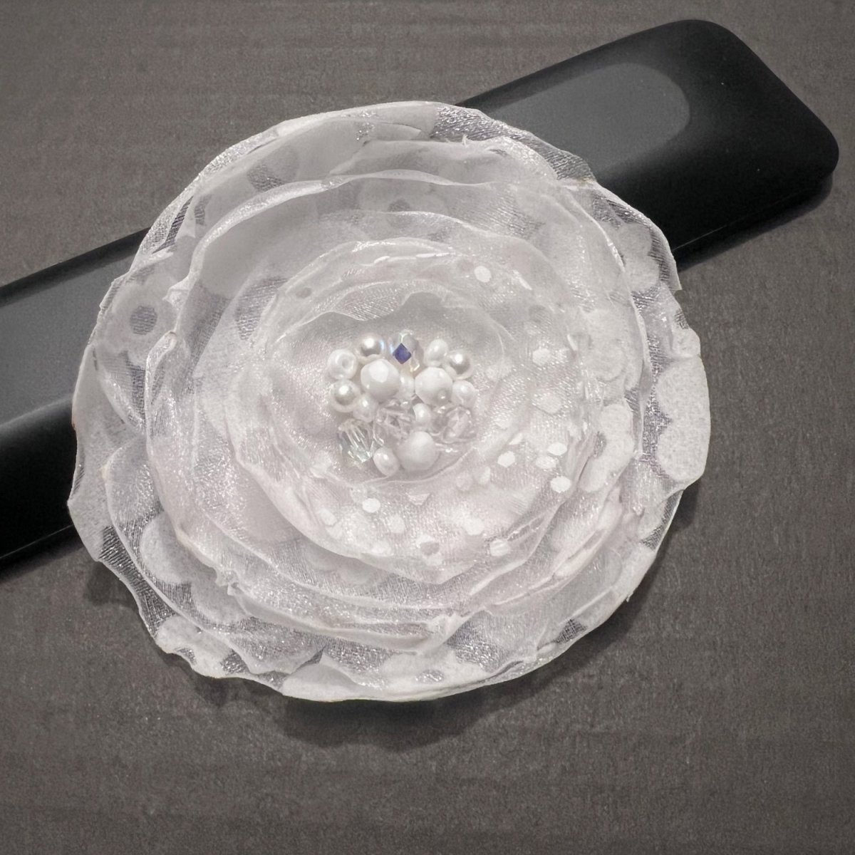 Organzová brož se středem pošitým korálky. Průměr brože cca 10 cm, brožové zapínání.