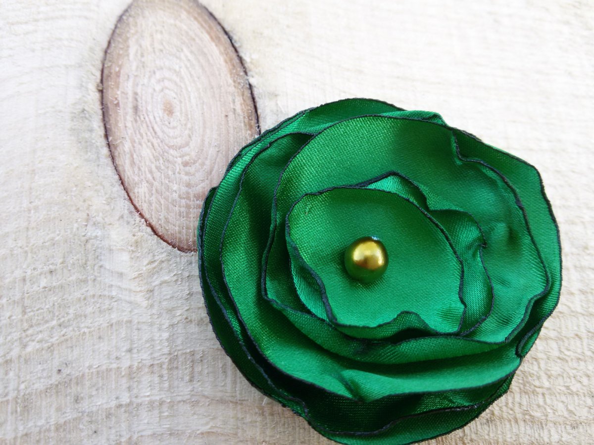 Kytička je velká cca 5,5 x 5,5 cm.Střed tvoří perlička,která je přišitá.Kytička je připevněna na brožovým můstku.