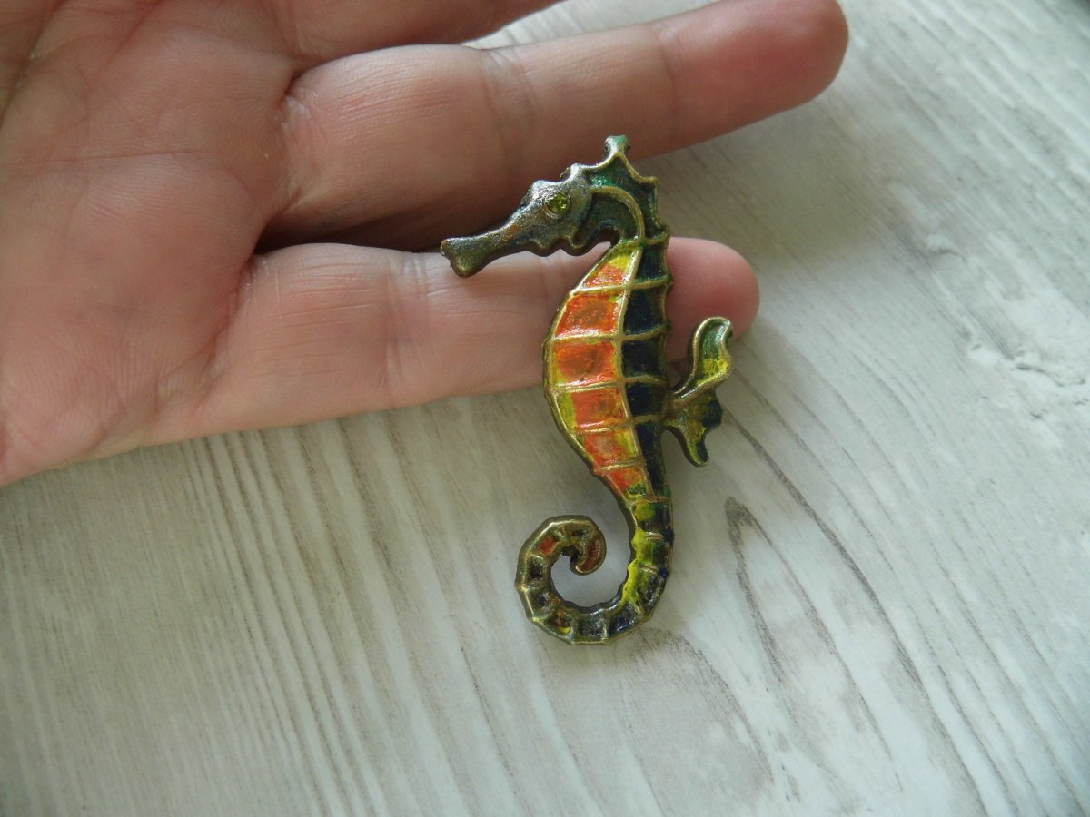 Kovový komponet mořský koník 57x25mm, upraveno na brož, barva kovu bronzová - patina,barva,očička-zirhonky,brož.jehla