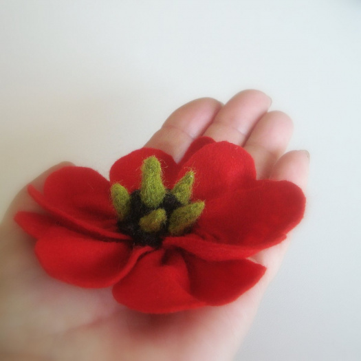 Velká brož vlčího máku z pravého vlněného filcu potěší oko i ducha milovníků květin.Střed je ručně plstěný z barveného ovčího rouna.Vzadu na zavírací špendlík.S touto broží budete nepřehlédnutelná.