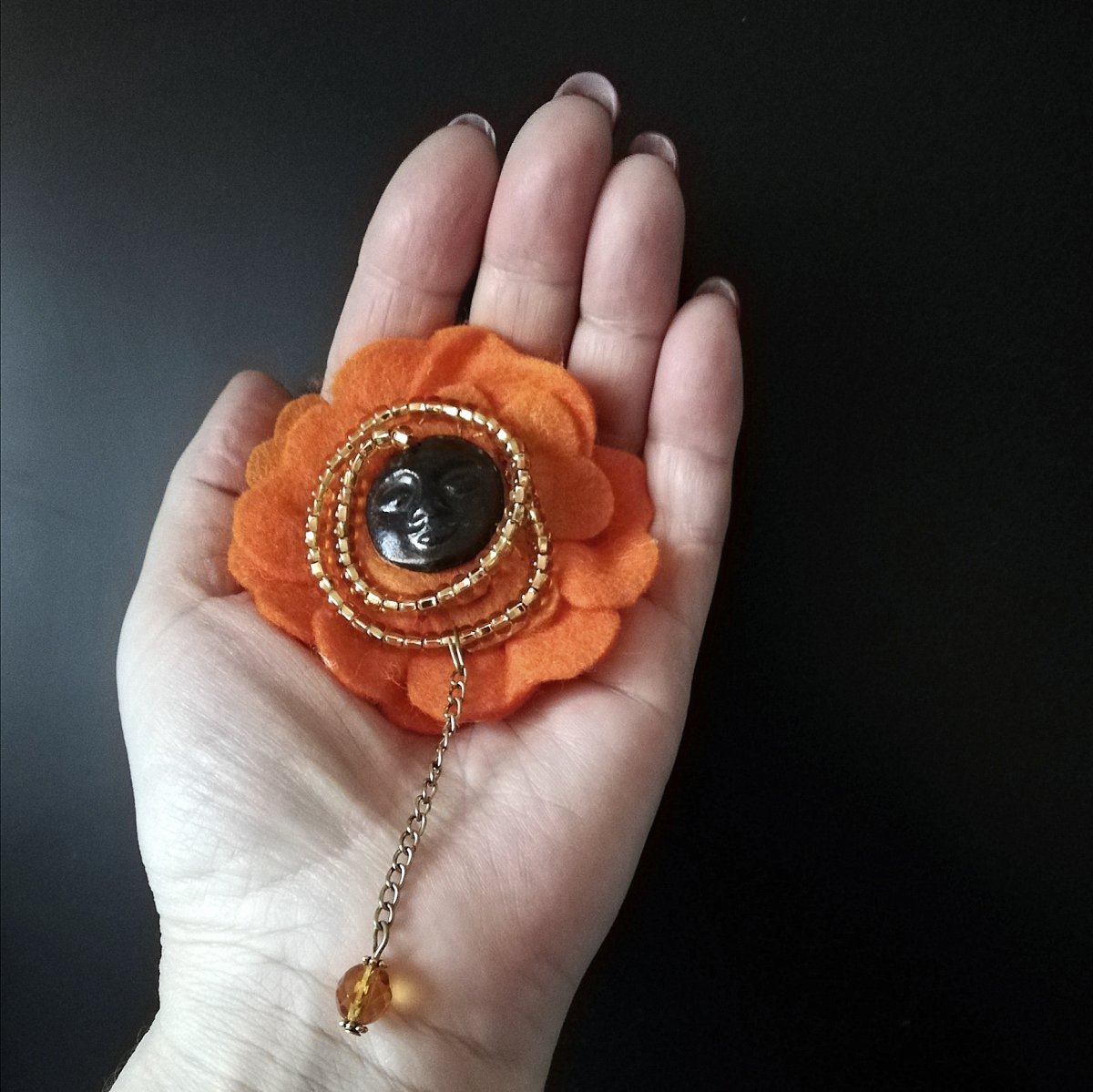 Velká brož z pravého vlněného filcu potěší oko i ducha milovníků exotiky.Střed je z glazované keramiky.Vzadu na zavírací špendlík.S touto broží budete nepřehlédnutelná.