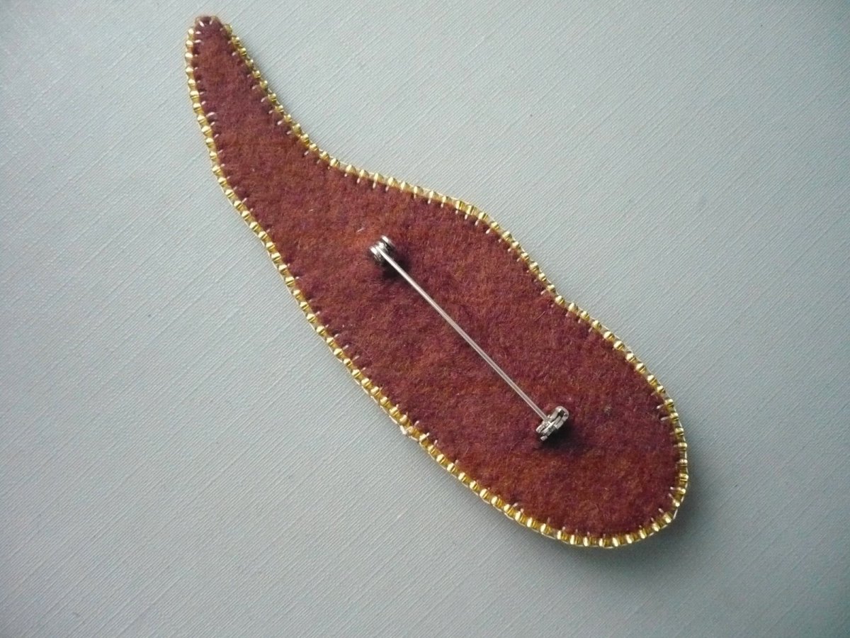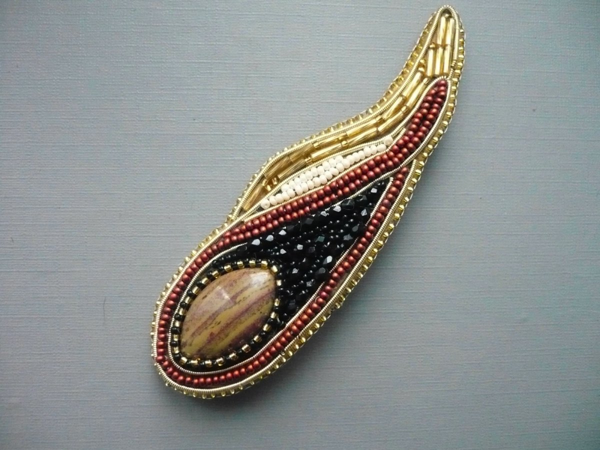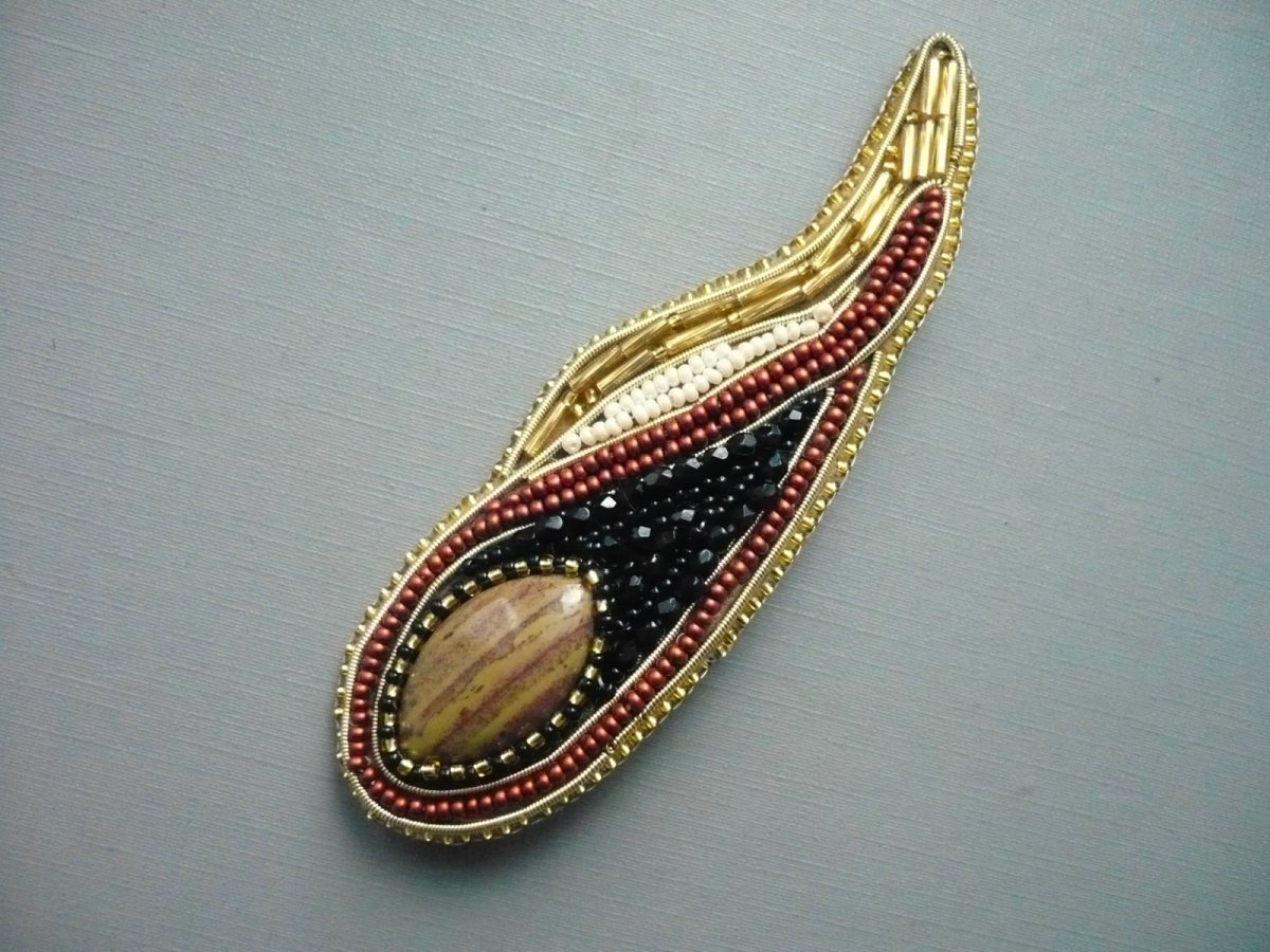 Ručně šitá brož z kvalitních rokajlových korálků Preciosa. Základem je kabošon jaspisu imperial, podložený hnědou plstí a obšitý korálky. Rozměr 105 x 33 mm. Na zadní straně je zavírací brožový špendlík (můstek), pomocí kterého lze brožku umístit na kabát, svetr či kabelku..