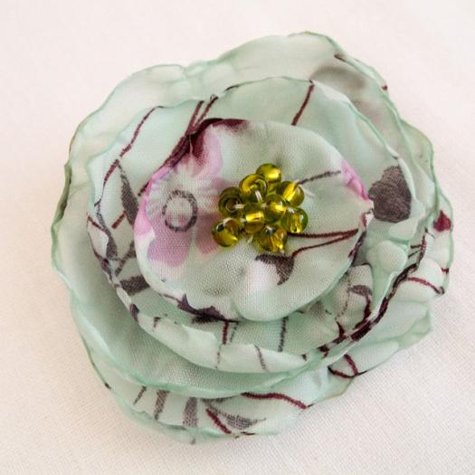 Vyrobena z recy tkaniny,průměr je 6cm,doplněno světle zelenými drobnými korálky,připíná se brožovým špendlíkem.